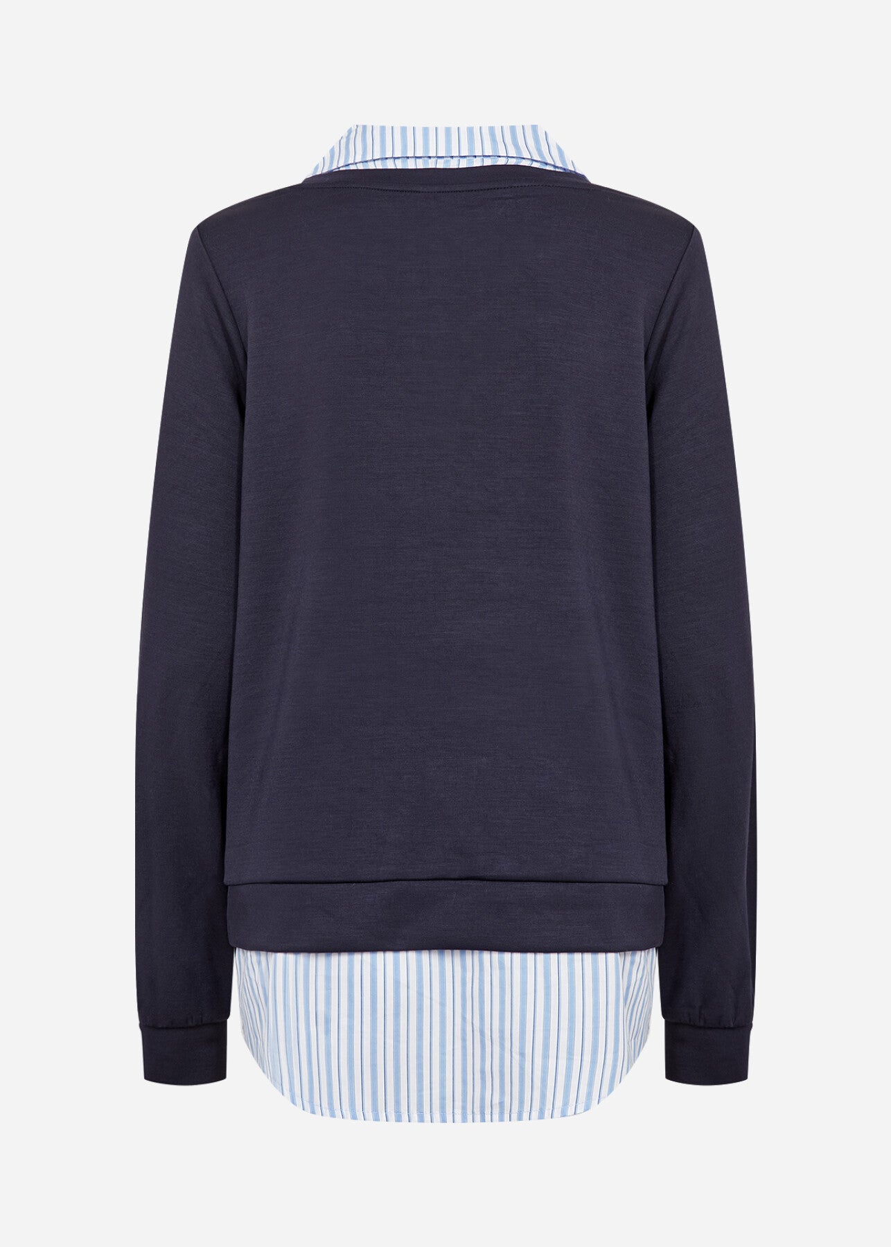 SC-BANU 298 er en bluse fremstillet af 48 % modal, 48 % polyester og 4 % elastan. Den har et stilfuldt lag-på-lag-design med en stribet krave og kant, som giver illusionen af en skjorte under en sweater. Sæt den sammen med jeans eller en nederdel for et cool lag-på-lag-look.