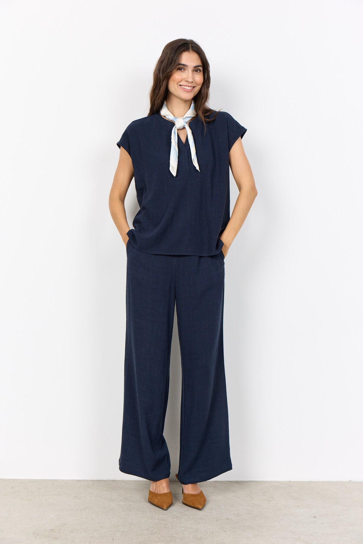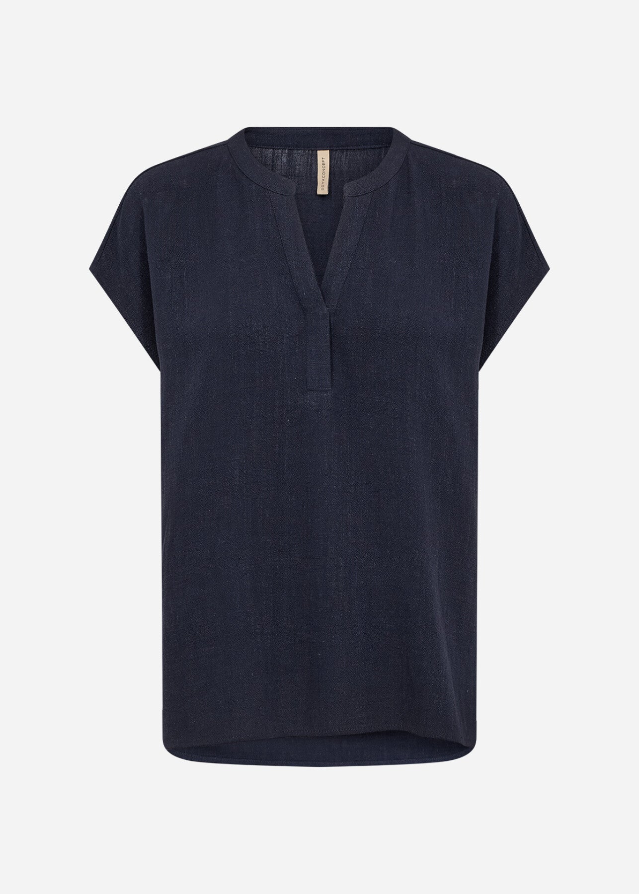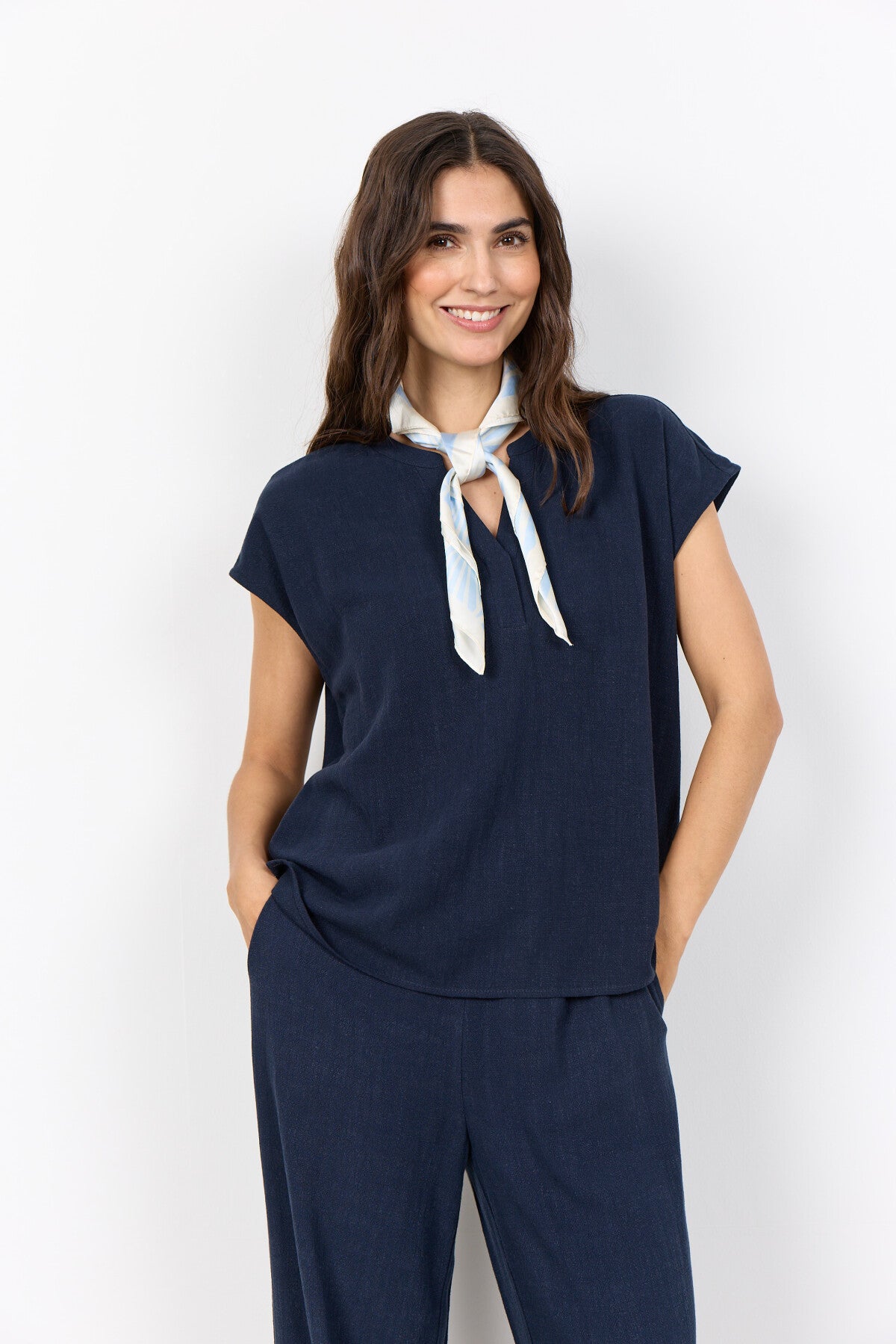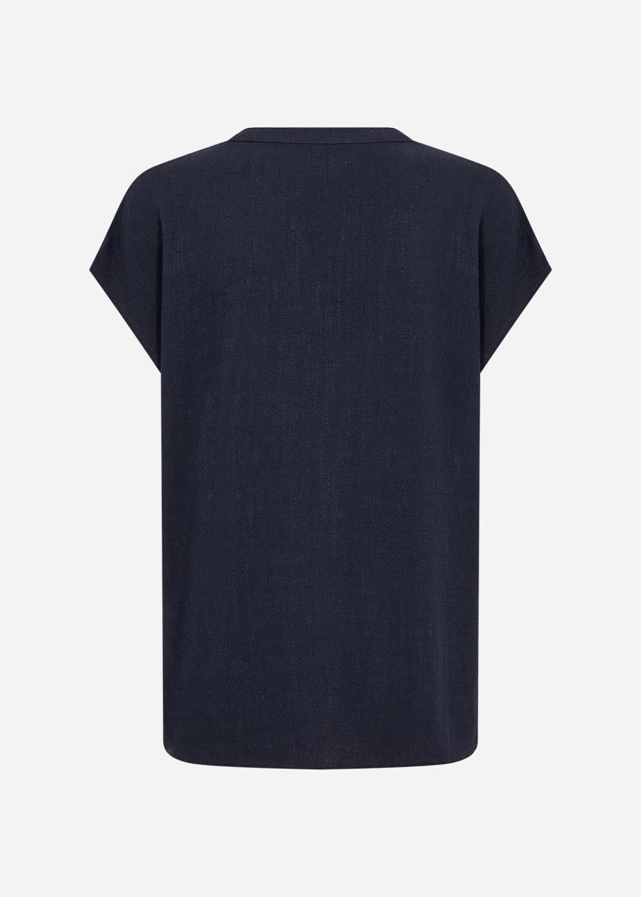 SC-CANNIE SOLID 1 er en T-shirt fremstillet af 70% LENZING™ ECOVERO™-viskose og 30% hør. Den har en stilfuld båndkrave med V-hals og korte ærmer, som giver et strejf af elegance. Sæt den sammen med skræddersyede bukser eller afslappede jeans for et sofistikeret look.